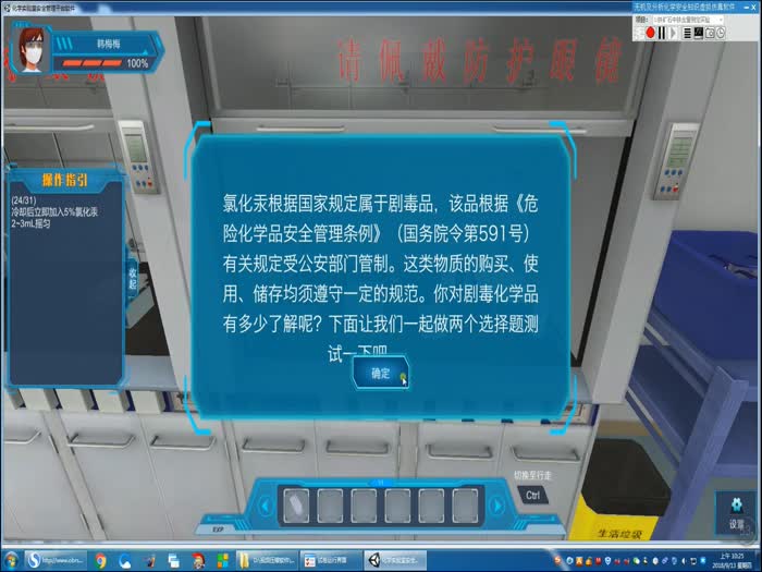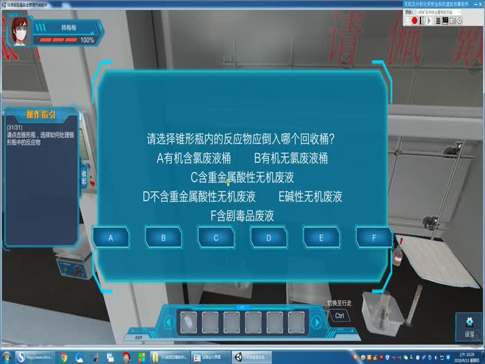 简介:通过典型化学实验“铁矿石中Fe含量的测定”将无机及分析化学实验安全知识进行了整合,以虚拟仿真软件为载体进行安全培训。软件主要包含两方面内容,一个是实验室环境熟悉及安全设施确认,一个是实验及安全事故应急处理仿真练习。