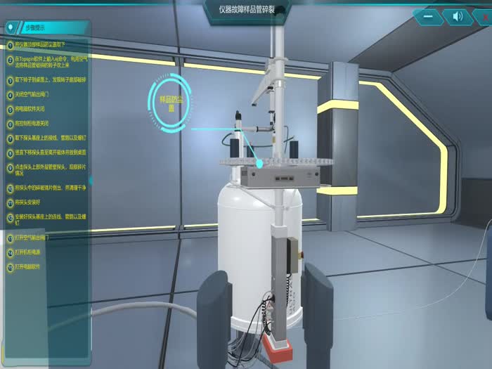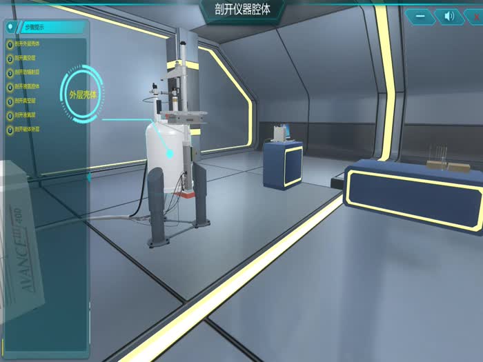 简介:包括仪器拆分、组装、半剖、维护、故障等主要内容,并对每个操作步骤进行提示以及对主要组件进行标注;用户通过鼠标自由拖动的方式将探头、匀场线圈等主要组件拆分或者组装;通过半剖操作将腔体内部如液氮层、真空层、液氦层、磁体等结构形象地表现出来;维护操作中真实再现了加液氮的操作过程,动态展示液氮放空以及液位升高等多种现象;与传统实验室相比,该软件中的故障处理在实验成本和安全性等方面的优势表现得淋漓尽致。